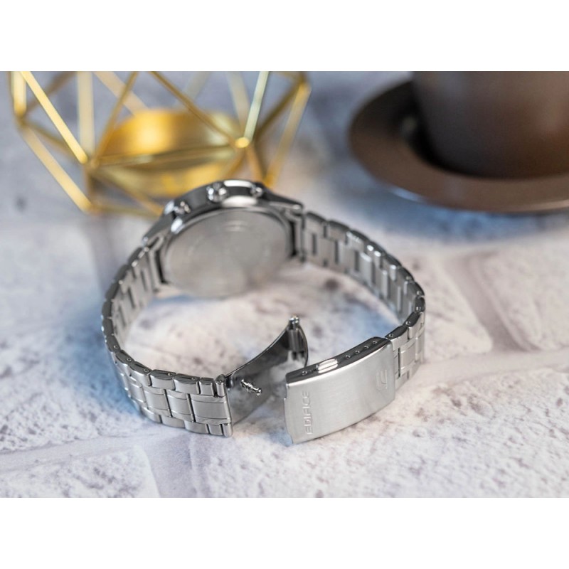 CASIO Edifice EFR-575D-1AEF – це годинник, розроблений для сучасних чоловіків, які цінують поєднання стилю, точності та функціональності. Його міцний корпус з нержавіючої сталі зі срібним покриттям виглядає динамічно та професійно, підкреслюючи спортивно-елегантний характер моделі. Браслет, виготовлений з того ж матеріалу, оснащений практичною застібкою-метеликом, яка гарантує безпеку та комфорт навіть під час цілоденного носіння.