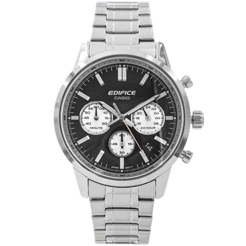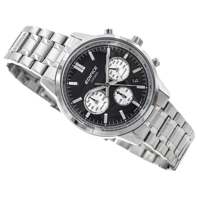 Ця модель вирізняється своїми деталями: виразні індекси, точно розроблені стрілки та три додаткові циферблати хронографа надають їй сучасного, технічного вигляду. Ненав’язливо розміщений індикатор дати в положенні «4 години» підвищує зручність щоденного використання годинника. Такі функції, як 60-хвилинний секундомір та 24-годинний дисплей часу, роблять EFR-575D-1AEF ідеальним як для роботи, так і для активного відпочинку. Циферблат захищений міцним мінеральним склом, стійким до незначних пошкоджень, а водонепроникність 10 бар дозволяє безпечно використовувати годинник навіть під час плавання або контакту з водою. Приглушені кольори — поєднання холодного сріблястого та насиченого чорного циферблата — роблять цю модель ідеальним доповненням як до костюма, так і до повсякденного одягу.