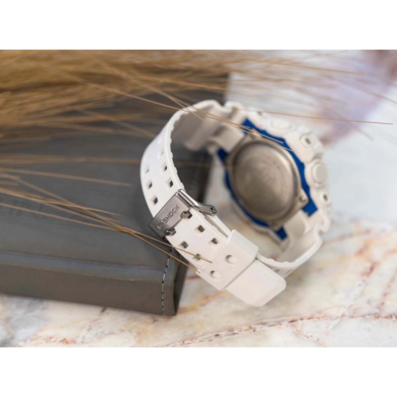 Casio G-SHOCK GA-700HDS-7AER – це модель, яка унікальним чином поєднує сучасну естетику з легендарною довговічністю серії G-SHOCK. Білий корпус і ремінець, виготовлені з міцної смоли, створюють цілісний, динамічний комплекс, підкреслюючи спортивний характер годинника, надаючи йому свіжого, сучасного вигляду. Виразні сині стрілки контрастують з циферблатом, який має флуоресцентне покриття, що надає моделі унікального характеру – під впливом світла циферблат підсвічується ледь помітним сяйвом, забезпечуючи чудову читабельність у темряві та надаючи годиннику унікального, енергійного виразу. Модель GA-700HDS-7AER зберігає всі характеристики, які роками визначали серію G-SHOCK – міцну, ударостійку конструкцію та високу водонепроникність до 200 метрів. Це робить годинник ідеальним для будь-яких умов, як під час щоденного використання, так і під час інтенсивної фізичної активності чи водних видів спорту. Функціональність цієї моделі відповідає очікуванням найвибагливіших користувачів. Точний кварцовий механізм працює з цифро-аналоговою системою, пропонуючи широкий спектр корисних функцій, таких як секундомір з точністю 1/100 секунди, таймер, п'ять щоденних будильників – включаючи один з функцією повтору будильника – та відображення світового часу, що охоплює 48 міст. Практичне світлодіодне підсвічування Super Illuminator гарантує чудову видимість за будь-яких умов, незалежно від часу доби чи навколишнього освітлення. Casio G-SHOCK GA-700HDS-7AER призначений для тих, хто шукає годинник з унікальним характером, що поєднує спортивну функціональність із сучасним дизайном. Ця модель виділяється як на зап'ясті, так і в повсякденному носінні – міцна, зручна та завжди готова до викликів дня.