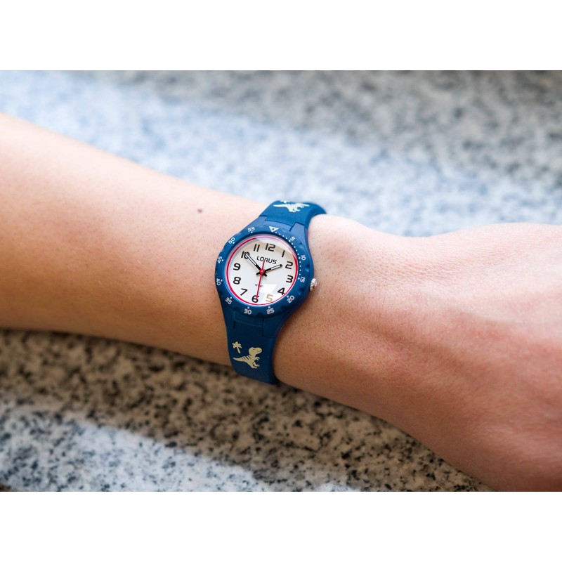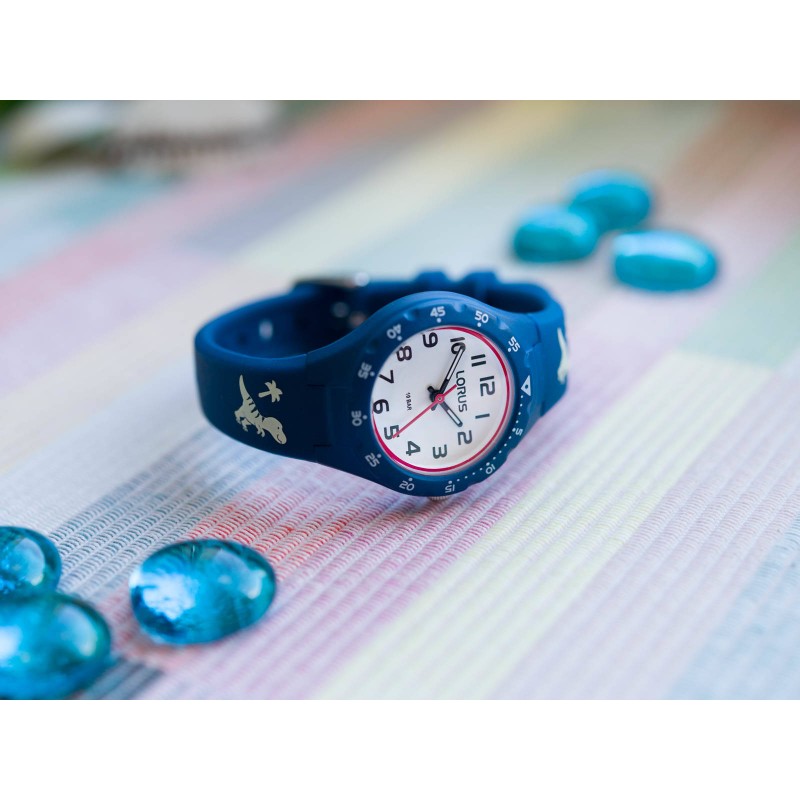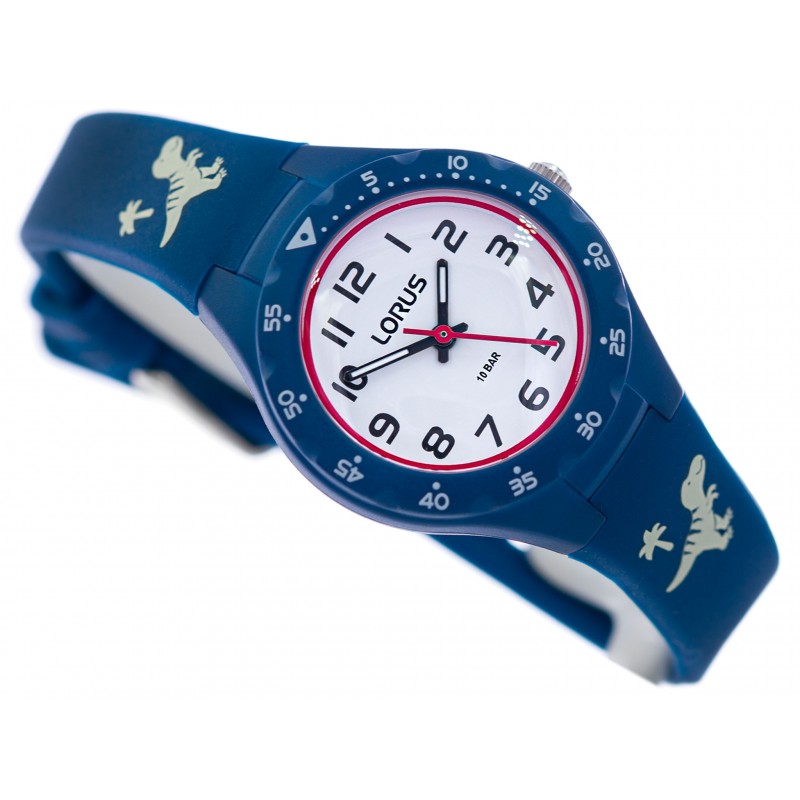 Lorus RRX49GX9модель створена для хлопчиків. Корпус і ремінець виготовлені зі зручного легкого темно-синього пластику. На гумовому ремінці нанесені зображення веселого динозавра. Білий циферблат має чіткі цифри, які полегшать читання часу, особливо дітям, які починають свою пригоду з часом. Руки покриті необритом, тому при попаданні на світло вони деякий час світяться в темряві. Lorus RRX49GX9 водонепроникний, ви можете плавати в ньому, не боячись затоплення. Пам’ятайте, що не можна використовувати шнурок під водою. Ця модель маєтвердий кварцовий механізм,живиться від змінної батареї. Годинники Lorus поставляються зі стильною та оригінальною коробкою від виробника.