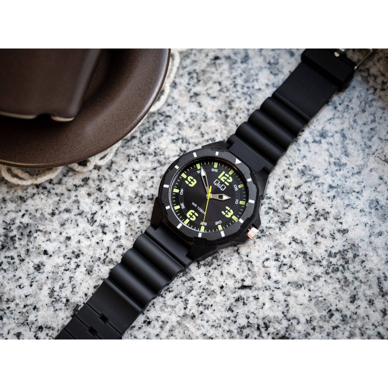 Q&Q V30A-005VYцеспортивний годинник на ремінці. Виріб виготовлено ззручного пластикукласичного чорного кольору. Чіткі арабські цифри на циферблаті, що чергуються з вертикальними індексами, позначають години. Контрастні зелені акценти на циферблаті добре помітні та надають моделі свіжості. Циферблат захищено прозориммінеральнимсклом, яке є ударостійким. Всередині японський кварцовий механізм - MIYOTA. Клас водонепроникності 100M, тому ви можете легко плавати з годинником. Q&Q V30A-005VY сподобається людям, які цінують зручні годинники в спортивному стилі.