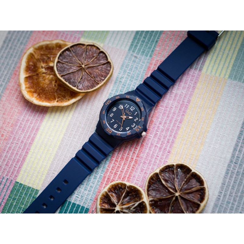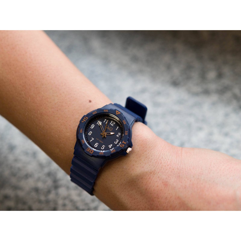 Q&Q VR19J018Y стане чудовим вибором на подарунок для хлопчика , який починає свою пригоду з вивчення годинника. Це ідеальний перший годинник для дитини завдяки його розбірливості. Циферблат темно-синього кольору, захищений прозорим плоским акриловим склом. Години позначені білими арабськими цифрами. Зчитування поточного часу не є проблемою завдяки використанню контрастних кольорів. І стрілки, і цифри фосфатовані , тому вони світяться деякий час після експонування. Зручний пластик ремінець, він підійде на зап'ясті з окружністю від 14,5 см до 21 см. Клас водонепроникності 10BAR дозволяє плавати з годинником на зап'ясті , це дуже практично параметр серед дитячих годинників.