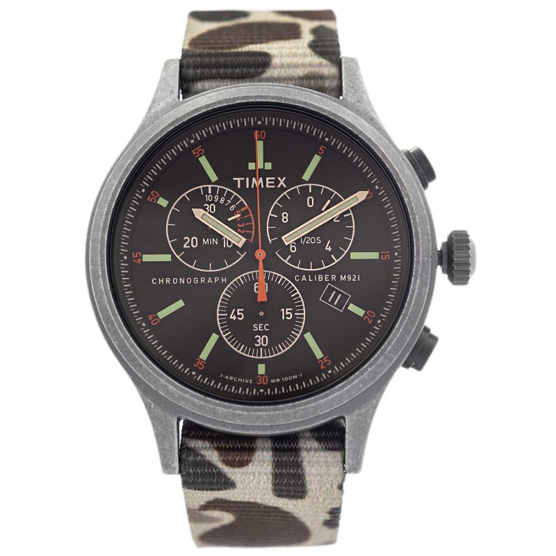 Timex TW2V09600LGце продукт, розроблений для справжніх шукачів пригод. Використаний матеріал ремінця зручний для носіння, а камуфляжний малюнок дозволяє брати годинник у поле. Він оснащений кварцовим механізмом, що живиться від змінної батареї. На чорному циферблаті є великий аналоговий секундомір і індикатор дати. Циферблат виглядає дуже розбірливим. Варто відзначити, що стрілки покриті Люмінесцентне покриття, а також ця модель має підсвічування INDIGLO. Після натискання на заводну головку зчитування часу в темряві не викличе жодних проблем. У набір входить елегантна коробка виробника, яку легко можна використовувати як подарункову упаковку.