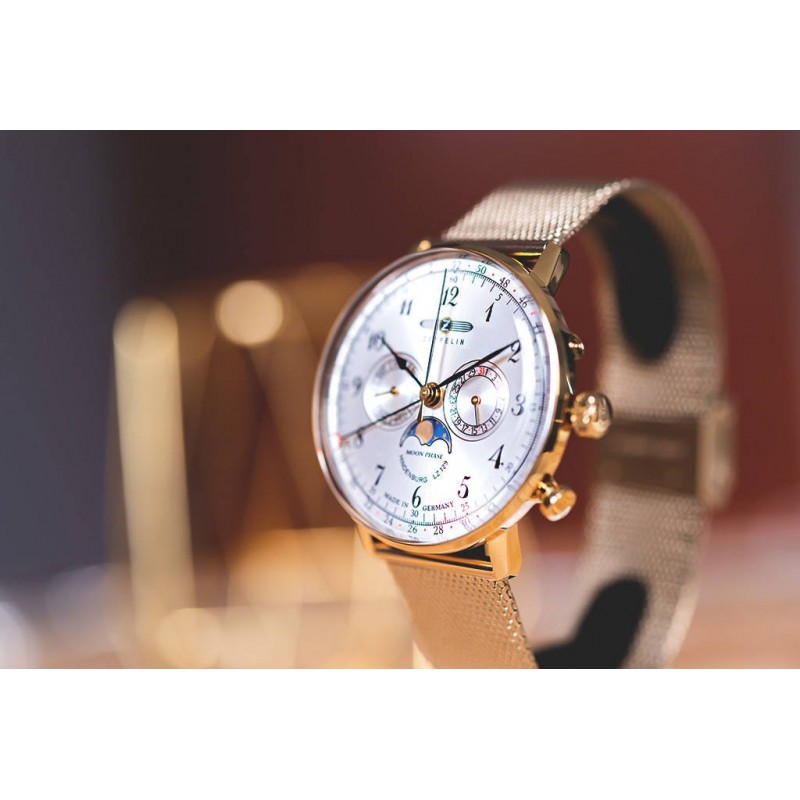 ZEPPELIN 7038M-1 LZ-129 HINDENBURG MONDPHASE оснащений кварцовим, точним швейцарським механізмом RONDA 706B . Годинник виготовлений в Німеччині. Він оснащений великою міткою часу , яка показує поточний день тижня та день місяця. Додаткова стрілка показує число тижня в році. О 6 годині є індикатор фази місяця . Глянцевий корпус золотистого кольору має типову для цієї марки форму, виготовлену з нержавіючої сталі, стійкої до корозії. Він з'єднується з легко регульованим сітчастим браслетом. Циферблат захищений куполообразним гезалітовим склом. Ця модель ефектно виглядає на чоловічому зап’ясті