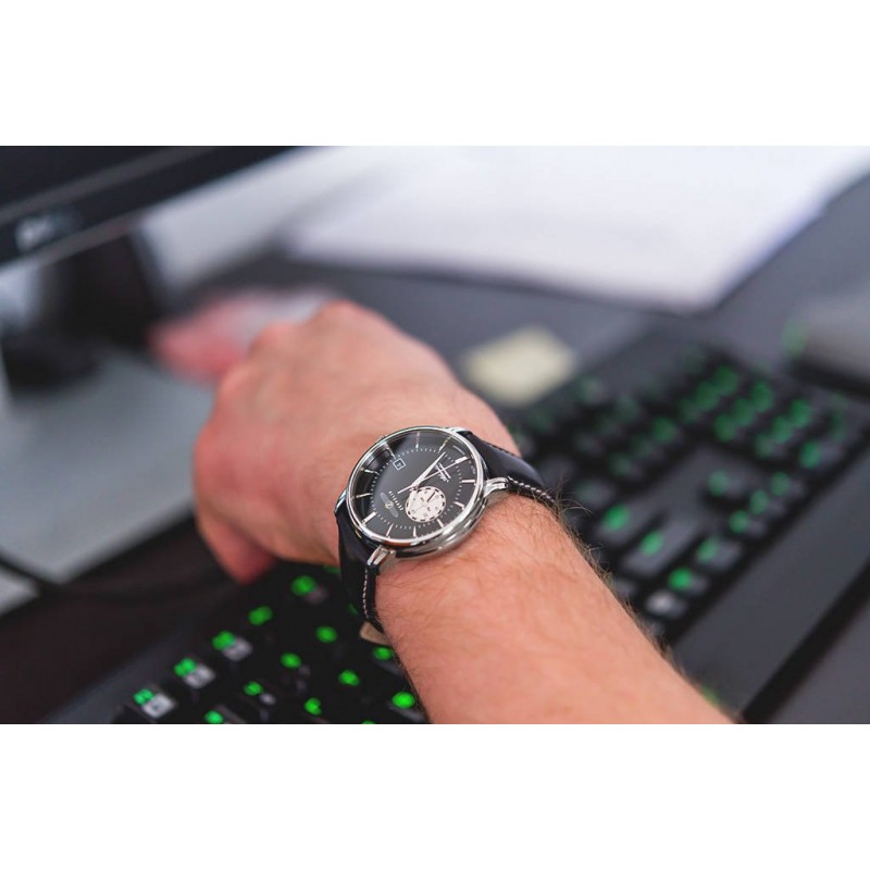 ZEPPELIN ATLANTIC 8470-2елегантно виглядає на зап'ясті чоловіка. Використані кольори - завжди модний і класичний чорний у поєднанні зі сріблом роблять годинник чудовим. Циферблат моделі має розширену апертуру дати, яка вказує поточний день місяця і час у 24-годинному форматі. Циферблат захищений опуклим мінеральним склом К1. Сріблясто-білі стрілки фосфоресцюють і світяться деякий час після впливу світла. Задня кришка годинника скляна, що дозволяє спостерігати за роботою автоматичного механізму калібру 8217 з 21 коштовністю. Таймер буде працювати, якщо носити його на зап’ясті. Його також можна затягнути вручну за допомогою коронки.