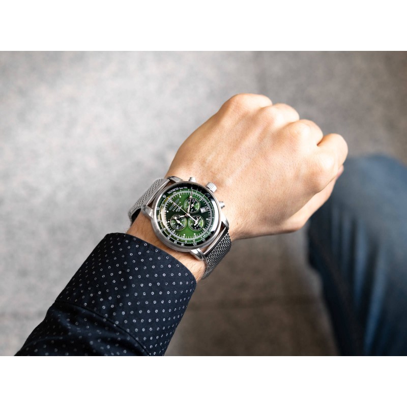 ZEPPELIN 100 Jahre Ed.1 8680M-4 має характерну для бренду форму корпусу. Великий сріблястий чохол дуже ефектно виглядає в поєднанні з сітчастим браслетом. Використана застібка-метелик є безпечною та зручною. Пляшково-зелений циферблат захищений опуклим мінеральним склом, стійким до зовнішніх факторів. Крім бездоганного зовнішнього вигляду, годинник оснащений безліччю корисних функцій. На 4 годині ми знаходимо штамп з датою, який вказує день місяця. У даній моделі також є будильник і аналоговий секундомір, які управляються за допомогою бічних кнопок. Варто додати, що вимірювання часу можливе до 12 годин. Слід зазначити, що весь щит покритий флуоресцентною фарбою, яка після витримки покращує видимість на тривалий час. Серцем цієї моделі є точний кварцовий механізм Ronda 5130.D. ZEPPELIN 100 Jahre 8680M-4це продукт високого класу, про що свідчать високоякісні компоненти та ретельне виконання. Виробник додав до цієї моделі елегантну коробку, що робить цей виріб ідеальною ідеєю для подарунку.