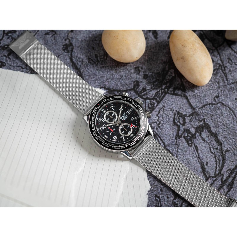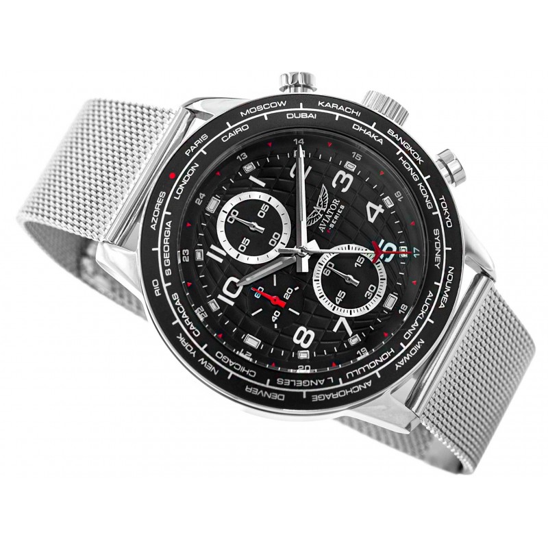 Aviator серії F AVW79886G407 — це стильна модель, яка привертає увагу. Срібний, сталевий корпус розміщений на сітчастому браслеті. Годинник оснащено аналоговим лічильником секунд, який вимірює час до 60 хвилин. Управління здійснюється за допомогою кнопок з правого боку. На срібні стрілки розміщені фосфоресцентні елементи, тому після впливу світла вони деякий час світяться в темряві. Чорний циферблат з логотипом виробника оснащений контрастними індексами. Він дозволяє зчитувати час незалежно від умов освітлення. Інші часові пояси позначені на чорному кільці навколо циферблата. Завдяки високому класу водонепроникності 100M можна безпечно плавати з годинником на руці. Aviator F-Series AVW79886G407 стане ідеальним елегантним і функціональним доповненням до вашого повсякденного стилю. Він упакований в оригінальну упаковку, тому його можна подарувати.