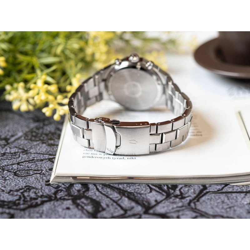 Bulova 96B410 Precisionist — модель, розроблена для чоловіків, які цінують точні та розкішні аксесуари. Цільний срібний корпус поєднується з браслетом такого ж кольору. Застібка-метелик браслета проста у використанні та забезпечує його безпеку на руці, завдяки додатковому елементу, який запобігає випадковому розстібанню. Годинник повністю виготовлений із високоякісної, стійкої до корозії нержавіючої сталі. Чорний циферблат має чітко видимі вертикальні сріблясто-білі фосфоресцентні годинникові індекси, що полегшує читання поточного часу. За роботу хронографа відповідають додаткові диски на циферблаті. Управління здійснюється за допомогою бічних кнопок. Ще однією перевагою є календар Календар, який показує поточний день місяця. Всередині надійнийкварцовий механізм. Символ 262 кГц, розміщений у нижній частині циферблата, доводить, що він розроблений із застосуванням спеціальної технології Надвисокої частоти. Безсумнівно, модель годинника Bulova Precisionist привертає увагу. Найякісніші комплектуючі та увага до кожної деталі роблять цю модель унікальною. Оригінальна елегантна шкатулка ідеально підходить для подарунку.