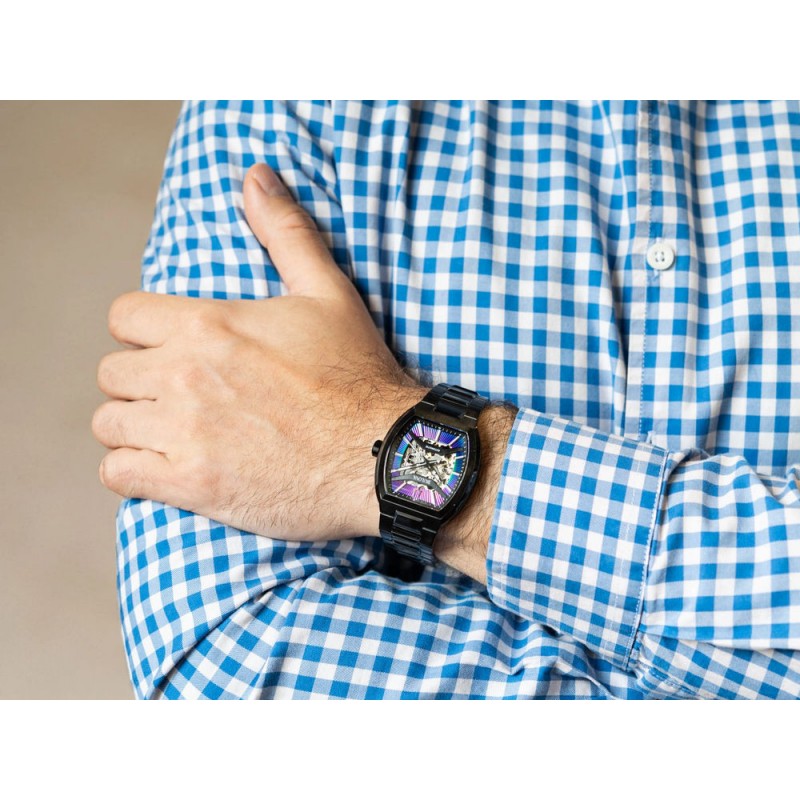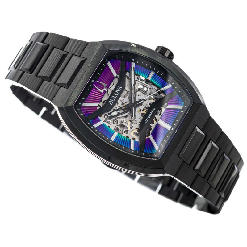 Bulova 98A320 Maquina – це самобутній чоловічий годинник, який успішно поєднує сучасну естетику з класичним годинниковим мистецтвом. Унікальний циферблат привертає увагу з першого погляду – багатовимірний, з рифленою структурою та ледь помітним мерехтінням різними кольорами залежно від кута світла. Його прозора частина розкриває захоплюючу внутрішню частину механізму, створюючи унікальний ефект глибини та динаміки. Корпус, виготовлений з високоякісної нержавіючої сталі, у поєднанні з чорним браслетом з елегантним оздобленням створює цілісний, розкішний цілісний елемент. Годинник оснащений практичною та естетичною застібкою-метеликом, що забезпечує комфортне носіння та надійну фіксацію на зап'ясті.