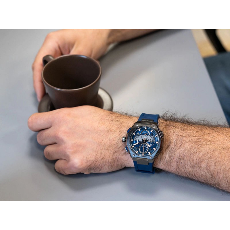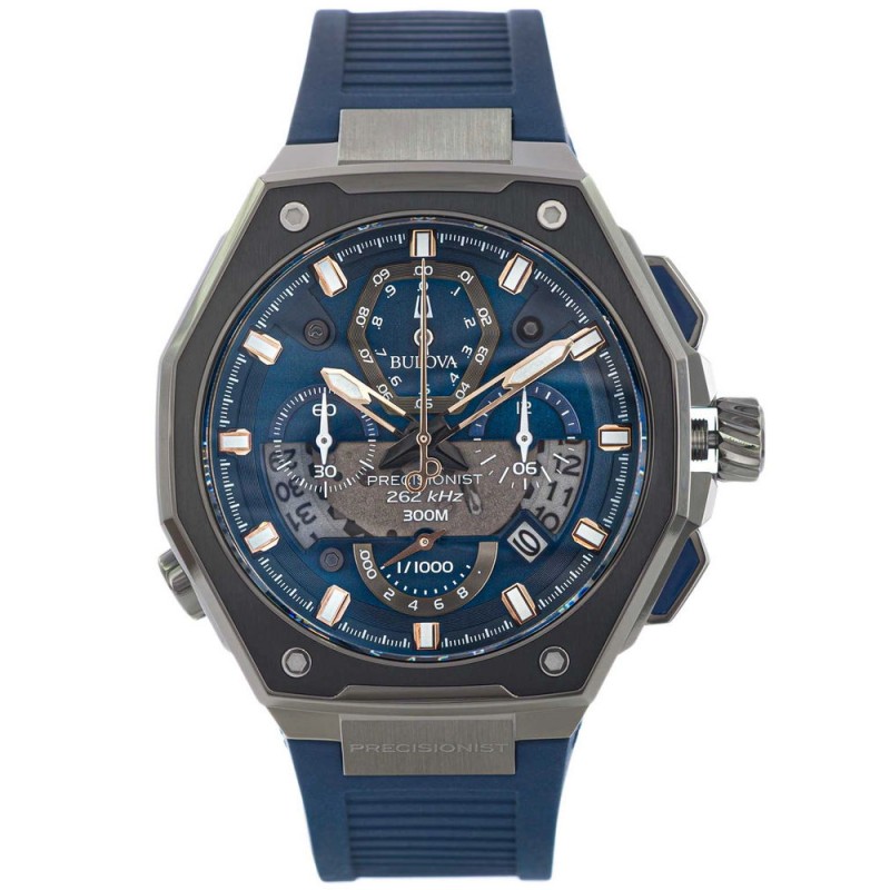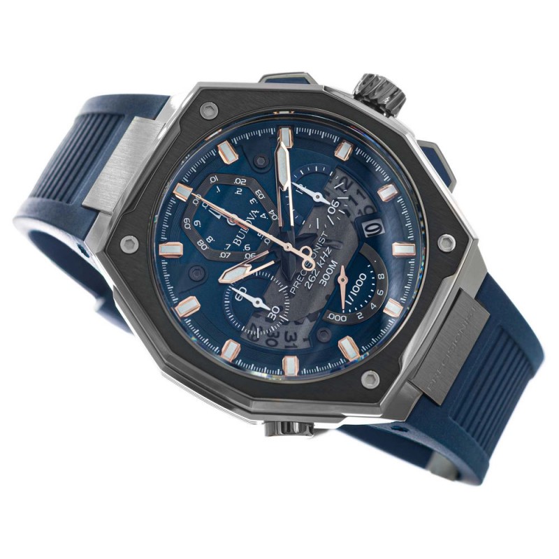 Серцем годинника є запатентований кварцовий механізм Precisionist Ultra High Frequency 262 кГц, конструкція якого забезпечує надзвичайно плавний рух секундної стрілки та неперевершену точність, перевершуючи стандартні кварцові механізми. Символ 262 кГц на циферблаті є чітким посиланням на цю технологію, а також слугує тонким елементом, що позначає десяту річницю серії Precisionist. Текстурований синій гумовий ремінець контрастує з графітовим корпусом, додаючи сучасної легкості та спортивного характеру, зберігаючи при цьому вишуканий стиль. Традиційна пряжка забезпечує комфорт і стабільність, а ретельна обробка ремінця підкреслює високий стандарт майстерності всього годинника.