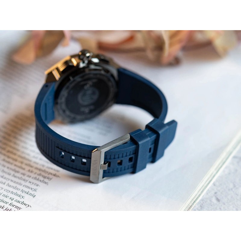 Bulova 98B357 Precisionist X – це годинник, який поєднує найновіші технологічні досягнення зі сміливим, сучасним дизайном та винятковою точністю. Корпус з нержавіючої сталі графітового кольору має чітко визначену архітектурну структуру, в якій кожна деталь – від делікатно скошених країв до ретельно оброблених поверхонь – підкреслює як міцність, так і елегантність. Чіткі, яскраві індекси та стрілки контрастують з темним циферблатом, забезпечуючи ідеальну читабельність за будь-яких умов освітлення, а їхні ретельно підібрані пропорції гармоніюють з динамічними додатковими циферблатами хронографа, функції яких керуються ергономічно розташованим набором бічних кнопок. Індикація дати тонко розташована між четвертою та п'ятою годинами, зберігаючи збалансований дизайн та функціональність, що підходить для щоденного носіння.