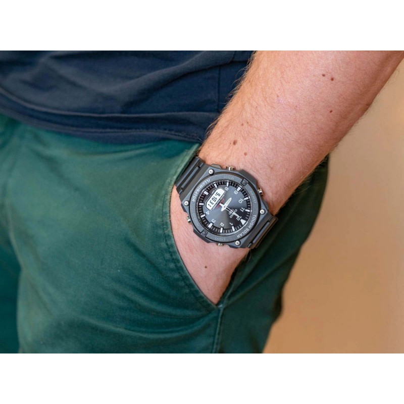 Casio AQ-S820W-1AVEF – це чоловічий годинник, який поєднує сучасні технології з динамічним, спортивним характером, пропонуючи надійність та комфорт для щоденного носіння. В його основі лежить інноваційний сонячний механізм. Система Tough Solar дозволяє заряджати годинник як від природного, так і від штучного світла. Це рішення не тільки усуває необхідність регулярної заміни батареї, але й покращує зручність використання та захист навколишнього середовища. Після повного заряду годинник працює до 10 місяців у стандартному режимі та до 23 місяців у режимі енергозбереження. Режим енергозбереження активується автоматично, коли годинник не використовується протягом тривалого часу або в темряві, максимально збільшуючи термін служби батареї. Корпус і циферблат виготовлені з легкого, міцного матеріалу, що надає годиннику спортивного, рішучого силуету. Скло Hesalite захищає цифровий дисплей від незначних подряпин та ударів, зберігаючи читабельність навіть під час інтенсивного використання. Чорний гумовий ремінець ідеально адаптується до форми зап'ястя, забезпечуючи комфорт протягом усього дня та стійкість до суворих умов, включаючи контакт з водою. Функціональність моделі вдосконалена до найменших деталей. Водонепроникність до 100 метрів дозволяє плавати та контактувати з водою, не боячись пошкодити механізм. Годинник пропонує широкий спектр практичних функцій: точний секундомір з точністю до 1/100 секунди, таймер та п'ять щоденних будильників, які можуть служити нагадуванням про важливі події. Також доступний погодинний сигнал часу (функція SIG). Автоматичний календар автоматично враховує коротші місяці, а відображення днів тижня різними мовами та можливість встановити 12- або 24-годинний формат підвищують зручність. Світовий час дозволяє відстежувати час у великих містах та часових поясах по всьому світу, що робить цю модель практичним супутником у подорожах. Стрілки мають фосфоресцентне покриття Люмінесцентне покриття, яке після впливу світла світиться деякий час, що полегшує читання годинника. Крім того, світлодіодне підсвічування робить зчитування часу в темряві швидким і зручним, а сигнали кнопок можна вимкнути за потреби за допомогою функції вимкнення звуку, зберігаючи при цьому повну функціональність будильників і таймерів. Casio AQ-S820W-1AVEF – це годинник, який поєднує спортивну функціональність із сучасним дизайном, вписуючись у щоденний ритм життя активного чоловіка. Його характерний чорний силует і ретельно продумані функції роблять його не лише практичним інструментом, але й стильним аксесуаром, що підкреслює характер і динамізм власника.