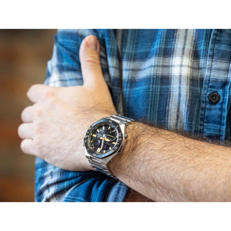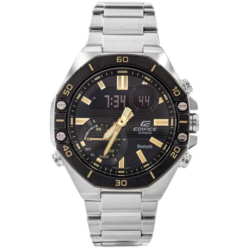 Casio Edifice ECB-10DB-1A9EF – це пропозиція для чоловіків, які цінують поєднання сучасних технологій з класичною елегантністю. Годинник має аналого-цифровий циферблат із золотими стрілками та індексами, що додають престижу, а покриття Люмінесцентне покриття забезпечує комфортне зчитування часу навіть у темряві. Ця модель має функцію Bluetooth, яка дозволяє легко синхронізувати її зі смартфоном та отримувати швидкий доступ до налаштувань і додаткових опцій. Вона пропонує п'ять незалежних будильників, точний секундомір і таймер зворотного відліку. Підсвічування циферблата та цифрового дисплея також добре працюють у повсякденних ситуаціях, забезпечуючи читабельність навіть при слабкому освітленні.