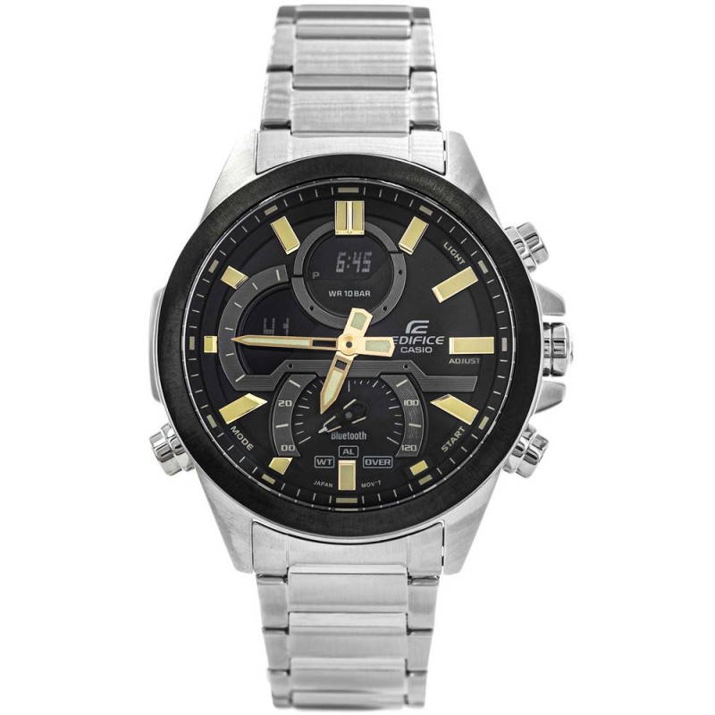 Casio Edifice ECB-30DB-1A9EF – це сучасний чоловічий годинник, який поєднує класичний стиль із функціональністю. Його аналогово-цифровий циферблат має золоті стрілки та індекси, які завдяки люмінесцентному покриттю світяться в темряві під дією світла, забезпечуючи кращу читабельність. Ця модель пропонує ряд практичних функцій, які підходять для щоденного використання. Найвідмітнішою особливістю є підключення Bluetooth, яке дозволяє синхронізувати годинник зі смартфоном і легко керувати його налаштуваннями. Користувач може встановити п'ять будильників для нагадування про важливі події, а функція Таймер дозволяє відраховувати запрограмований час. Корисний Секундомір дозволяє точно вимірювати час активності, а в умовах слабкого освітлення допомагають підсвічування циферблата та цифровий дисплей.