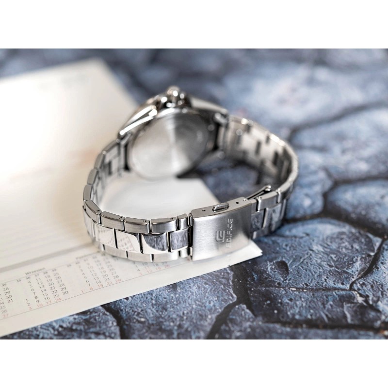 Casio Edifice EFV-100D-8AVUEF — унікальний годинник, який вражає поєднанням сучасного дизайну, функціональності та надійної якості. Його срібний браслет, виготовлений із високоякісної нержавіючої сталі, не тільки міцний і стійкий до корозії, але й має точну обробку, що додає елегантності всьому дизайну. Застібка-метелик забезпечує комфорт використання та захищає від випадкового розстібання. Сріблястий циферблат із тонким сонячним світлом, який ефективно відбиває світло, надає годиннику сучасний характер. Чіткі годинникові індекси та тонкі стрілки в класичному стилі гарантують читабельність, а технологія люмінесцентного покриття дозволяє їм світитися в темряві після впливу світла, що корисно для вечірніх заходів. Весь захищений плоским мінеральним склом, стійким до подряпин і щоденного використання, що підкреслює практичний вимір цієї моделі.