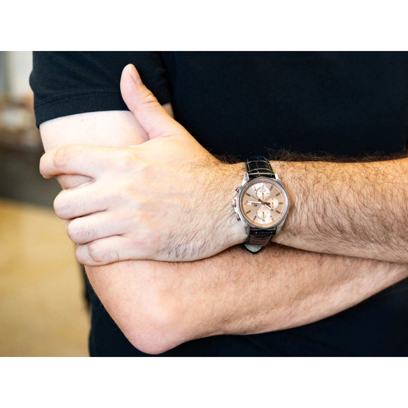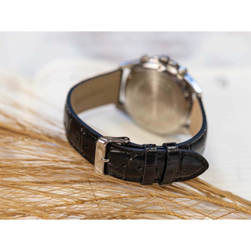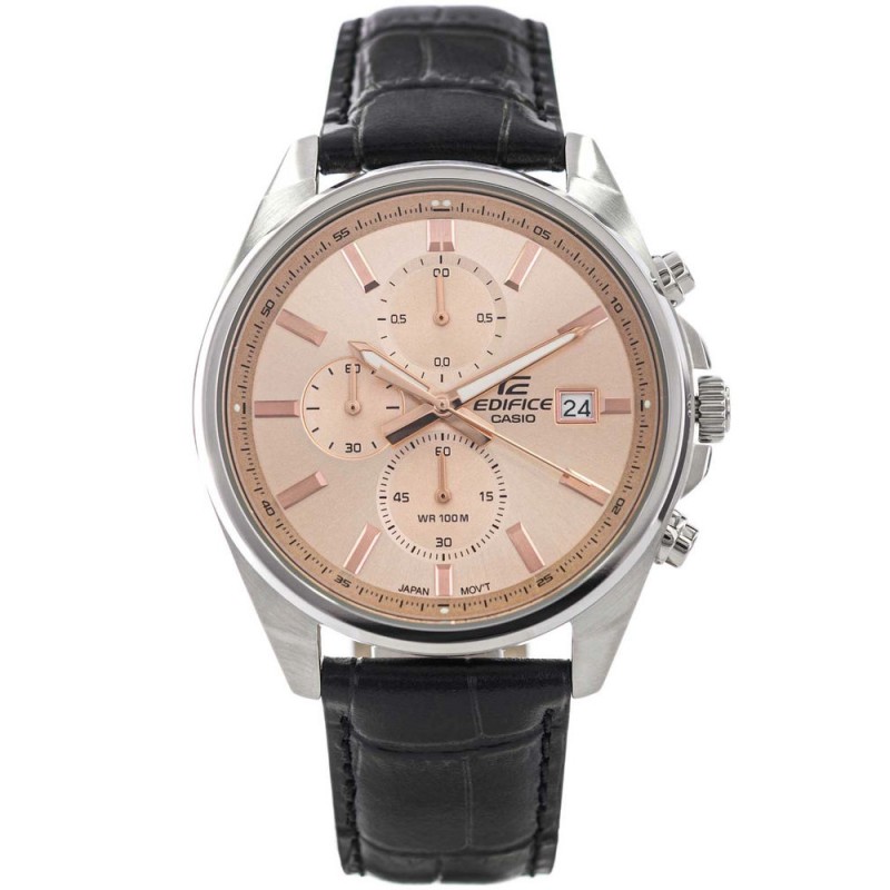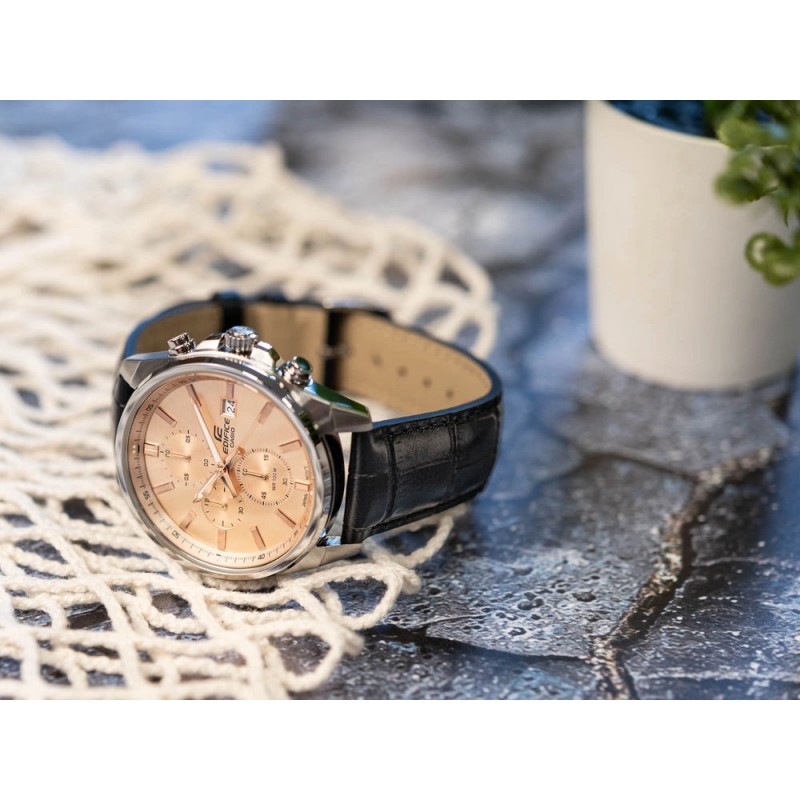 Casio Edifice EFV-610EL-5AVUEF – це годинник, який гармонійно поєднує класичну елегантність із сучасним стилем, створюючи пропозицію для чоловіків, які цінують як естетику, так і функціональність. Срібний корпус з нержавіючої сталі, ретельно відполірований, підкреслює міцність конструкції та додає годиннику престижного характеру, а чорний шкіряний ремінець з ніжною текстурою доповнює дизайн, забезпечуючи комфорт та елегантне оздоблення. Центральним елементом годинника є циферблат кольору рожевого золота, прикрашений ніжним сонячним покриттям, яке створює ледь помітну гру світла залежно від кута падіння променів. Цей розкішний циферблат контрастує зі срібними деталями та чорним ремінцем, створюючи гармонійну та вишукану композицію. Тонкі стрілки, покриті фосфоресцентним покриттям Люмінесцентне покриття, гарантують чудову читабельність навіть при слабкому освітленні після експозиції, а дрібні деталі, такі як додаткові циферблати секундоміра та індикація дати о 3 годині, підкреслюють технічний характер годинника. Вікно дати розташоване на 3 годині. Модель EFV-610EL-5AUEF оснащена точним японським кварцовим механізмом, що забезпечує надійність і точність. Аналоговий секундомір дозволяє вимірювати час з точністю до 1/10 секунди, а мінеральне скло захищає циферблат від незначних пошкоджень, підвищуючи довговічність годинника при щоденному використанні. Водонепроникність до 100 метрів робить годинник стійким до випадкового контакту з водою, а його елегантний дизайн дозволяє легко поєднувати його як з діловим костюмом, так і з повсякденним одягом. Casio Edifice EFV-610EL-5AUEF – це годинник для чоловіків, які шукають годинник, що поєднує класичний характер із сучасною елегантністю, високою функціональністю та надійністю. Цей годинник тонко підкреслює зрілий стиль і ідеально підходить для будь-якої події – від ділових зустрічей, активних днів у місті до прогулянок вихідного дня.