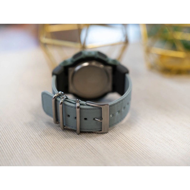Дизайн GA-010CE-2AER міцно вкорінений в ідеї відповідального виробництва. Ключові елементи корпусу та безеля виготовлені з біосмоли, отриманої з відновлюваної сировини, що зменшує вплив на навколишнє середовище, зберігаючи при цьому високу міцність структури. Ремінець виготовлений з тканини CORDURA re/cor, що поєднує виняткову міцність з переробленими волокнами. Весь виріб пофарбовано натуральними пігментами FOOD TEXTILE, що надає блакитно-селадоновому відтінку м’якого, природного відчуття та ледь помітних варіацій, що виникають завдяки використанню рослинних барвників. Японський кварцовий механізм, розміщений у легкому, але неймовірно міцному корпусі Carbon Core Guard, відповідає за точність годинника. Армована смола з вуглецевим волокном забезпечує захисну основу, яка дозволяє годиннику витримувати інтенсивне використання та сильні удари. Циферблат захищений мінеральним склом, а його читабельність після настання темряви покращується стрілками та індексами з фосфоресцентним покриттям Люмінесцентне покриття, яке світиться після впливу світла, та інтенсивним підсвічуванням Super Illuminator, яке освітлює всю поверхню яскравим світлом. Модель GA-010CE-2AER пропонує набір функцій, необхідних для повсякденного життя та активності. Секундомір, таймер, п’ять будильників, світовий час та автоматичний календар створюють практичний набір інструментів, який також є надзвичайно енергоефективним. Батарея забезпечує приблизно десять років роботи, що підкреслює довговічність та невибагливість годинника. Водонепроникність 200 метрів дозволяє використовувати його як для плавання, так і під водою. Цей годинник поєднує спортивний характер з тонким, свіжим акцентом кольору. Блакитно-селадоновий відтінок надає йому легкості та природності, створюючи дизайн, який привертає увагу та гармонійно поєднує сучасну естетику з філософією сталого творення.