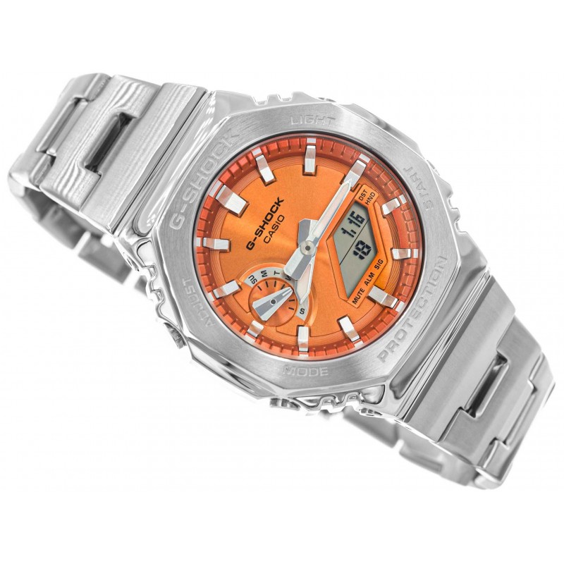 CASIO G-SHOCK GM-2110D-4AER — годинник, створений для тих, хто цінує надійність, інноваційні технології та стильний зовнішній вигляд. Як частина легендарної серії G-SHOCK, ця модель виділяється унікальним поєднанням міцності та сучасного дизайну. Твердий сріблястий корпус, ретельно розроблений і виготовлений з матеріалів найвищої якості, випромінює вишуканість і стійкість до суворих умов щоденного використання. Браслет з нержавіючої сталі не тільки підкреслює елегантний характер годинника, але й забезпечує чудовий комфорт і довговічність. Застібка-метелик гарантує впевненість у носінні, водночас додаючи вишуканості годиннику. Що виділяє модель GM-2110D-4AER, так це її розширені функції. Гібридний циферблат, що поєднує в собі аналогові та цифрові елементи, розроблений для читання та простоти використання в будь-якій ситуації. Завдяки світлодіодному підсвічуванню годинник можна читати навіть у темряві, а стрілки, вкриті люмінесцентним покриттям, під впливом світла випромінюють м’яке світло, що полегшує читання при слабкому освітленні. Для людей, які ведуть активний спосіб життя, годинник пропонує практичні функції, такі як Секундомір і Таймер, які дозволяють точно вимірювати час під час тренувань або інших завдань. Крім того, п’ять щоденних будильників підтримують щоденну організацію, допомагаючи вам залишатися пунктуальними. Функція погодинного сигналу часу (SIG) дозволяє зручно керувати часом, а режим вимкнення звуку (Mute) забезпечує обережність у місцях, де потрібна тиша. Незважаючи на елегантний дизайн, модель GM-2110D-4AER, як і будь-який G-Shock, розроблена з урахуванням екстремальних умов. Стійкість до ударів і магнітних полів гарантує надійність у будь-якій ситуації, а водостійкість до 200 метрів робить цю модель ідеальною для плавання, дайвінгу та інших водних розваг. Циферблат захищений міцним мінеральним склом, яке ефективно запобігає появі подряпин, забезпечуючи довговічність і естетичність годинника. CASIO G-SHOCK GM-2110D-4AER - це годинник, який гармонійно поєднує в собі функціональність і елегантність. Універсальний стиль робить його ідеальним доповненням як до повсякденного, спортивного одягу, так і до більш офіційного стилю. Це не тільки надійний інструмент, але й вираження індивідуальності та сучасного підходу до дизайну.