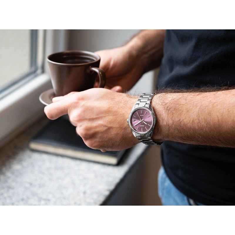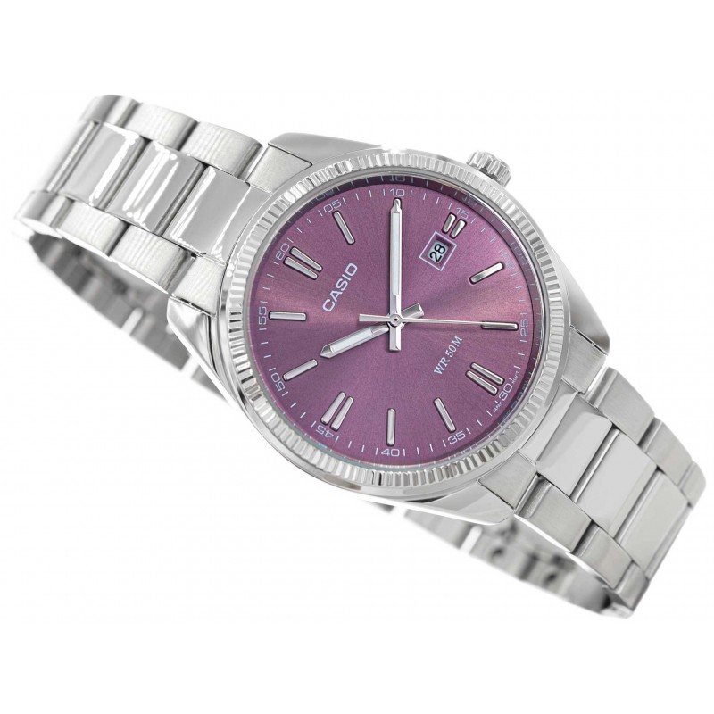 MTP-1302PD-6AVEF - нова кольорова версія відомої моделі Casio, яка завоювала популярність серед шанувальників бренду. Годинник має ретро-дизайн і незвичайний фіолетовий циферблат, що робить його чудовим доповненням до повсякденного стилю. Корпус кріпиться на срібний браслет з нержавіючої сталі. Блискучий циферблат, захищений мінеральним склом, має виразні вертикальні індекси. Календар біля 3 години показує поточний день місяця. Водонепроникність 50M дозволяє безпечно використовувати годинник у воді. Стрілки, збагачені фосфоресцентними елементами, полегшують читання часу в умовах поганого освітлення. Модель працює від японського кварцового механізму на батарейках. MTP-1302PD 6AV сподобається чоловікам, які цінують класичний стиль з унікальним акцентом.
