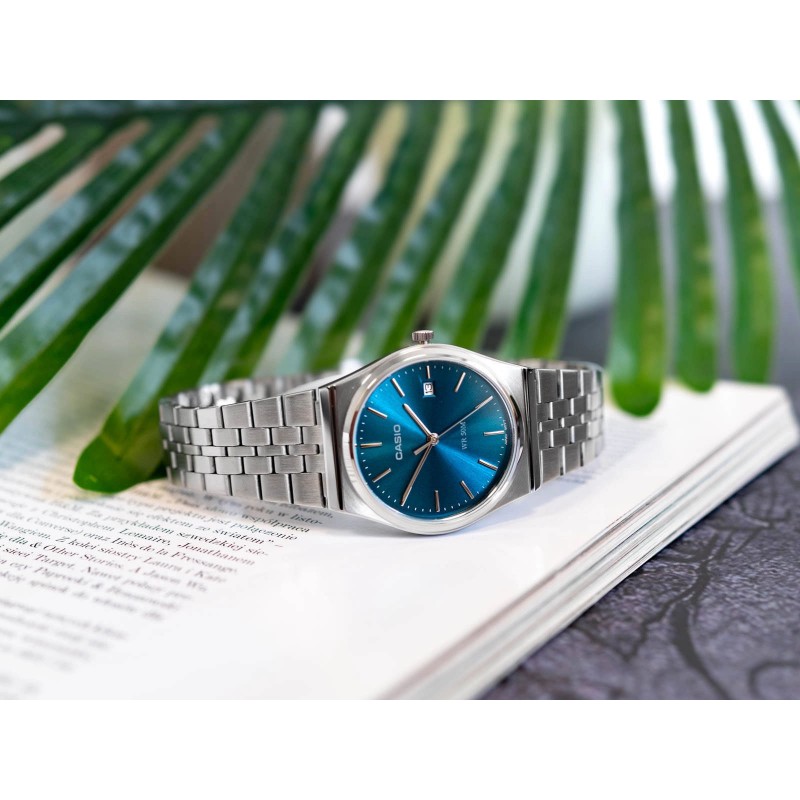 MTP-B145D-2A2VEF - нова кольорова версія годинника Casio в стилі ретро, популярна серед шанувальників цього бренду. Дизайн натхненний модою 80-х років. Корпус годинника розміщений на срібному браслеті з корозійностійкої нержавіючої сталі. Блискучий блакитний циферблат з огранюванням сонячних променів, захищений мінеральним склом, прикрашений контрастними вертикальними індексами. На 3 годині знаходиться календар, який показує поточний день місяця. Годинник має клас водонепроникності 50M, що дозволяє безпроблемно контактувати з водою. Всередині знаходиться японський кварцовий механізм, що працює від батарейки. Модель MTP-B145D-2A2VEF сподобається чоловікам, які цінують традиційний дизайн, але також люблять виділятися яскравими кольорами.