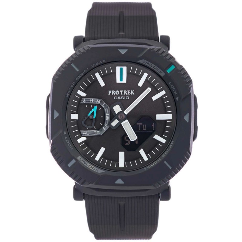 Відмінною особливістю PROTREK Годинник PRJ-B001-1ER – це інноваційний рухомий захисний безель. Він дозволяє миттєво змінювати зовнішній вигляд та використання годинника, адаптуючись до поточних потреб користувача. У положенні, де кнопки приховані, годинник набуває елегантної геометричної форми, ідеальної для щоденного використання – ідеально підходить для ділових зустрічей або спокійних прогулянок містом. Поворот безеля на 45 градусів відкриває кнопки, значно полегшуючи доступ до функцій, необхідних для активного відпочинку, таких як керування освітленням або синхронізація з мобільними пристроями. Завдяки цьому механізму годинник не тільки змінює свій характер, але й забезпечує неперевершений комфорт і точність керування функціями, що оцінить кожен ентузіаст трекінгу та пішого туризму. Модель PRJ-B001-1ER характеризується водонепроникністю 10 БАР – це означає, що годинник підходить для плавання або сильного дощу. Крім того, годинник розроблений для роботи за низьких температур, що робить його незамінним інструментом для зимових походів, коли температура падає до -10°C.