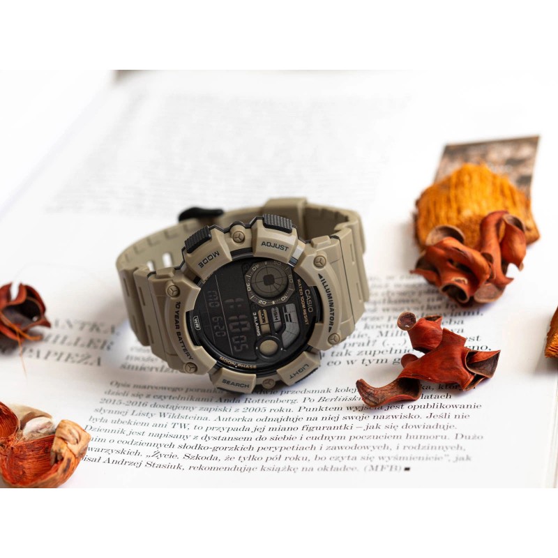 Casio WS-1500H 5BVEF – ідеальна пропозиція для чоловіків, які захоплюються риболовлею та цінують сучасні функціональні рішення. Годинник вирізняється міцним, масивним циферблатом, який не тільки точно показує час, але й пропонує широкий спектр інформації, корисної під час різноманітних заходів на природі. Чохол надітий на міцний бежевий ремінець з легкогопластику, що забезпечує комфортне навіть багатогодинне носіння. Модель WS-1500H 5BVEF була розроблена з урахуванням активних користувачів, тому виробник оснастив її численними функціями, які полегшують щоденне використання та підтримують спортивні заняття. Тут ви знайдете, серед іншого, Секундомір і Таймер, які ідеально підходять для тренувань або риболовлі, де точність відіграє ключову роль. Крім того, годинник має унікальну функцію вказівки фаз місяця та припливів для будь-якого вибраного місця та дати. Це надзвичайно практичне рішення для людей, які планують поїздки в дику природу і хочуть заздалегідь знати стан води в місці риболовлі. Така інформація може істотно підвищити ваші шанси на успішну риболовлю. Клас водонепроникності 10BAR означає, що ви можете плавати з годинником на руці. Функція подвійного часу дозволяє відстежувати два різні часові пояси одночасно, що особливо корисно для людей, які подорожують між країнами та континентами. Casio WS-1500H 5BVEF - це не тільки інструмент для рибалки, але й елегантний аксесуар, який чудово виглядає на зап'ясті чоловіка, поєднуючи сучасний дизайн з практичними функціями.