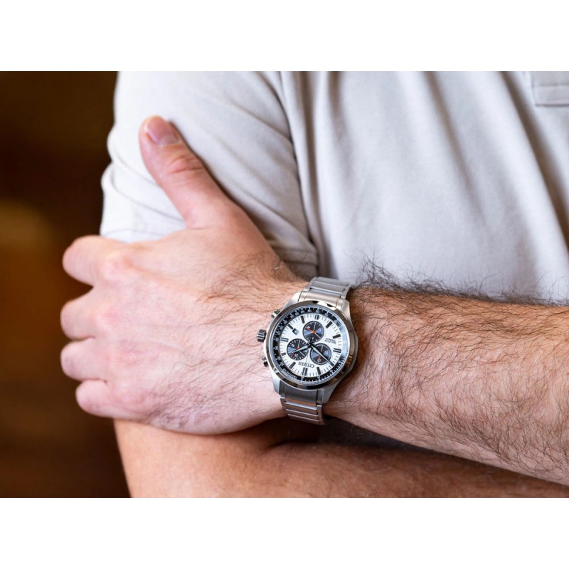 Citizen AT2530-85A Super Titanium Sporty Chronograph – це годинник, який гармонійно поєднує сучасні технології з вишуканою естетикою. Корпус і браслет виготовлені з фірмового матеріалу Super Titanium, посиленого покриттям Duratect, що робить поверхню стійкою до подряпин, ударів та корозії, зберігаючи при цьому свій ніжний металевий блиск на довгі роки. Легкий титан у поєднанні з ергономічним профілем браслета гарантує комфорт годинника навіть при тривалому носінні, а його гіпоалергенні властивості роблять його безпечним для шкіри. Оздоблення браслета та корпусу випромінює мінімалістичну елегантність, кожна деталь підкреслює майстерність та інженерну точність. Яскраво-білий циферблат годинника розроблений для поєднання функціональності з елегантністю. Його поверхня захищена сапфіровим склом, стійким до подряпин, а завдяки тонким індексам і точно розташованим додатковим циферблатам хронографа зчитування часу та вимірювань надзвичайно зручне та інтуїтивно зрозуміле. Хронограф дозволяє точно вимірювати інтервали до 60 хвилин з точністю до однієї секунди, а додаткові дисплеї включають 24-годинний час та дату. Стрілки мають фосфоресцентне покриття Люмінесцентне покриття, яке світиться протягом певного часу після впливу світла. Циферблат оточений тахіметричною шкалою – дизайн, натхненний класичними автомобільними годинниками, не лише підкреслює спортивний характер годинника, але й дозволяє практично використовувати функцію вимірювання середньої швидкості. Кожен елемент циферблата розташований таким чином, щоб підкреслити спортивний характер годинника, не порушуючи його гармонії та читабельності.