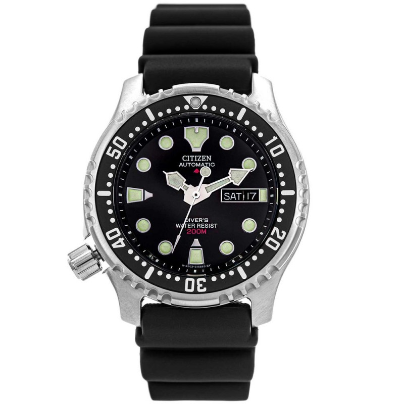 Citizen Promaster NY0040-09E Diver's стане ідеальним вибором для чоловіків, які шукають спортивний автоматичний годинник. Окрім чудового зовнішнього вигляду, варто звернути увагу на функціональність цієї моделі. Велике вікно дати дозволяє зчитувати поточний день місяця, а також день тижня, який може відображатися англійською або німецькою мовами. Сталевий корпус має обертовий безель, що зручно під час дайвінгу. Чорний ремінець виготовлений зі зручного, легкого в догляді пластику.