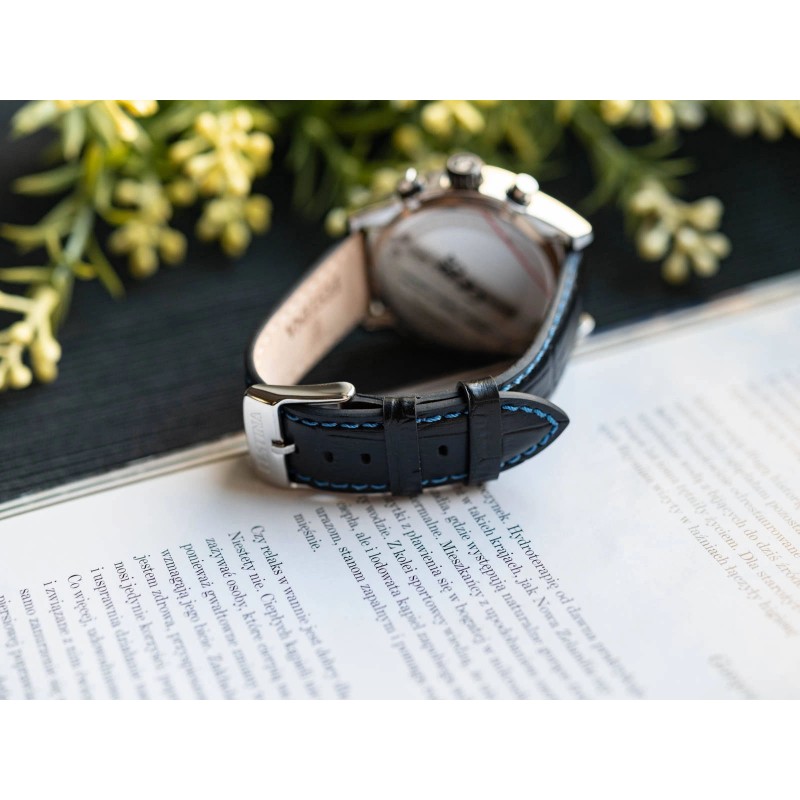 Festina Timeless Chronograph F20695/5 — це квінтесенція елегантності та функціональності у світі чоловічих аналогових годинників. Ця модель поєднує в собі сучасний дизайн, якісне виконання і практичні рішення, задовольняючи потреби навіть найвимогливіших користувачів. Універсальний характер робить його ідеальним як для офіційного стилю, так і для повсякденного використання. Годинник оснащений сріблястим корпусом з високоякісної нержавіючої сталі, що забезпечує довговічність і стійкість до корозії. Стильний контраст створює чорний шкіряний ремінець із класичною пряжкою, що забезпечує комфорт носіння та щільну посадку на зап’ясті. Центральним елементом дизайну є темно-синій циферблат, який вражає своєю глибиною та чіткою обробкою. На його поверхні розташовані сріблясто-білі стрілки та чіткі індекси, які для кращої видимості в темряві покриті люмінесцентним покриттям. Це означає, що після попереднього впливу світла вони дозволяють легко зчитувати час навіть в умовах поганого освітлення. Дизайн циферблата збагачено двома функціональними додатковими циферблатами – Аналоговими секундами та секундною стрілкою, які ідеально доповнюють ціле. На третій годині є практичний календар, непомітно включений в дизайн, а край циферблата прикрашений тахіметром, що дозволяє точно розраховувати швидкість. Весь захищений міцним мінеральним склом, яке ефективно захищає від подряпин і зберігає годинник у відмінному стані протягом тривалого часу.