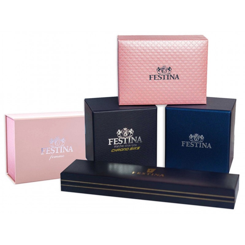 Festina — бренд із понад 100-річною традицією. Годинники бренду брали участь у багатьох різноманітних спортивних заходах, таких як Tour the France, завдяки чому бренд став впізнаваним у всьому світі. Пропозиція годинників Festina включає елегантні, класичні та спортивні годинники, чудовим прикладом останніх є серія Timeless Chronogaph. Годинники цього бренду упаковані в стильні коробки, які підійдуть як упаковка для подарункового годинника. Модель F20704/3 ідеально відображає припущення бренду - висока якість за доступною ціною.
