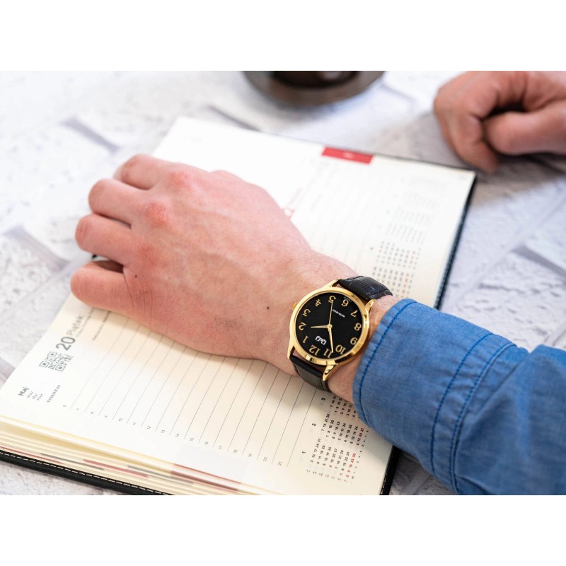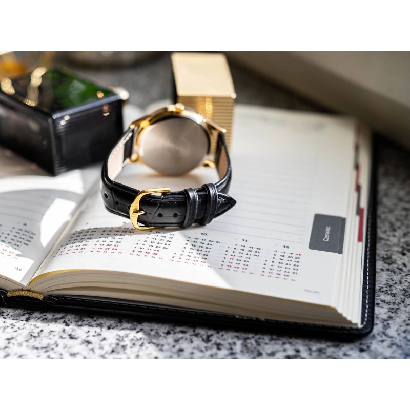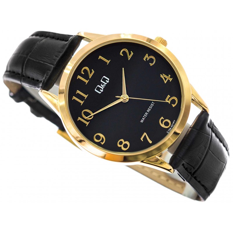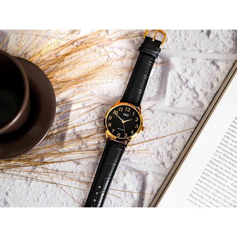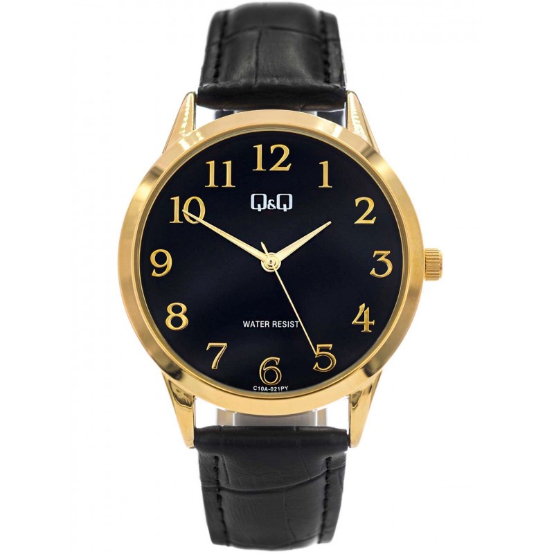Q&Q C10A-021PY стане ідеальним вибором для чоловіка, який шукає класичний годинник. Він працює від японського кварцового механізму, який живиться від змінної батареї. Блискучий золотистий металевий корпус підвішений до чорного ремінця. Назва бренду вказана на циферблаті, а години позначені чіткими контрастними золотими цифрами. Q&Q C10A-021PY стане ідеальною пропозицією для людей, які шукають годинник для щоденного використання. Завдяки тонкому дизайну цю модель легко сховати під рукавом сорочки.