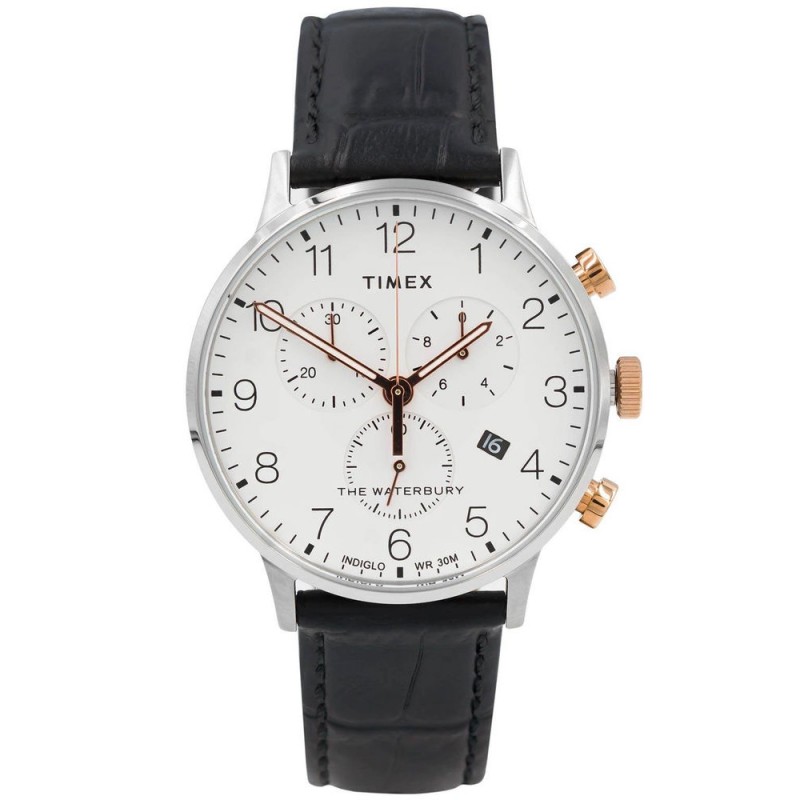 Timex TW2R71700 THE WATERBURY ідеально підходить для щоденного носіння. Корпус повністю виготовлений з високоякісної, стійкої до корозії нержавіючої сталі. Ремінець виготовлений з чорної шкіри. Читабельний білий циферблат має стрілки з червоного золота, покриті фосфором, які світяться деякий час після впливу світла. Індикатори годин - це чіткі чорні арабські цифри. Крім того, циферблат оснащений хронографом та практичним дисплеєм дати, розташованим поруч із положенням 4 години. Ця модель також має підсвічування циферблата INDIGLO. Після натискання на заводну головку, час буде легко читати в темряві.