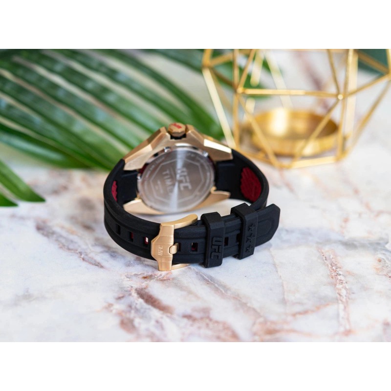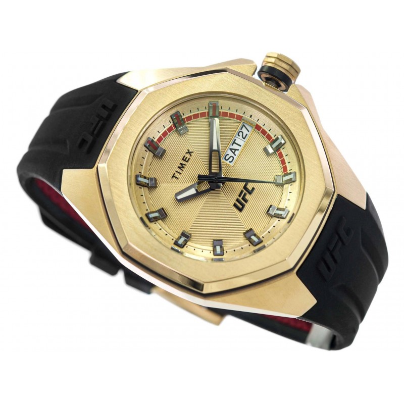 Timex TW2V57100 UFC Pro – модель, що поєднує в собі елегантний зовнішній вигляд і стиль, відсилаючи до американської федерації змішаних бойових мистецтв UFC. Золотистий сталевий корпус із безелем у формі восьмикутника поєднується зі зручним силіконовим ремінцем, який ідеально сидить на зап’ясті. Внутрішня частина ремінця має нековзку текстуру червоного кольору з логотипами UFC і виробника. На контрастні чіткі індекси нанесені фосфоресцентні елементи, які після освітлення деякий час будуть помітні в темряві. Фосфоресцирующие елементи також можна знайти на срібних стрілках, які ідеально контрастують із золотим циферблатом із крихітним червоним логотипом UFC. Праворуч на 3 годині є великий Календар із зазначенням поточного дня тижня та місяця. Серцем годинника є надійний і точний кварцовий механізм класу водонепроникності 100 м, що дозволяє вільно плавати. Timex TW2V57100, безсумнівно, стане ідеальним доповненням до повсякденного та елегантного стилю. Вхідна в комплект оригінальна упаковка виробника з логотипом UFC може служити елегантною подарунковою коробкою.