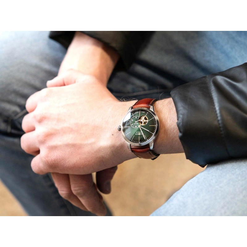 ZEPPELIN 8364-4 Flatline Open Heart Automatic – це годинник, що поєднує класичний дизайн із сучасними механічними рішеннями. Натхненний епохою новаторських авіаційних завоювань, цей елегантний годинник – ідеальний вибір для чоловіків, які цінують поєднання стилю, функціональності та точності годинникового мистецтва. Його збалансована кольорова гама, заснована на гармонії насичено-зелених, сріблястих деталей та благородних коричневих акцентів, робить цю модель надзвичайно універсальною – ідеальною як для повсякденного, так і для більш елегантного одягу. Корпус годинника виготовлений з високоякісної нержавіючої сталі, що гарантує його міцність та стійкість до щоденного носіння. Тонко поліроване покриття надає всьому годиннику ніжного блиску, підкреслюючи ексклюзивний характер моделі. Доповнює цей вишуканий дизайн ремінець з натуральної шкіри насиченого темно-коричневого кольору. М’який та гнучкий, він забезпечує чудовий комфорт носіння, додаючи годиннику класичного характеру. Найбільш привабливою особливістю цієї моделі є її унікальний циферблат. Його благородний зелений колір підкреслюється ніжним сонячним покриттям, яке ледь помітно відбиває світло, надаючи годиннику динамічного вигляду. Елегантні срібні лінійні індекси та точно контуровані стрілки роблять зчитування часу швидким та інтуїтивно зрозумілим. Однак, особливо варто відзначити деталь, яка вирізняє цю модель – віконце «Відкрите серце», яке відкриває фрагмент робочого механізму. Ця тонка, але ефектна особливість додає годиннику унікального характеру, підкреслюючи його механічне серце. Точна робота ZEPPELIN 8364-4 забезпечується надійним автоматичним механізмом Miyota Cal. 82S5, що використовує 21 камінь. Цей високоякісний механізм працює від природного руху зап'ястя, що усуває потребу в батарейці. Додатковою зручністю для власника є можливість вручну завести годинник за допомогою заводної головки, що дозволяє легко регулювати запас ходу. Прозора задня кришка корпусу – ще одна особливість, яку оцінять любителі точної інженерії – вона дозволяє милуватися складною роботою механізму, розкриваючи деталі ретельно виготовлених компонентів. ZEPPELIN 8364-4 Flatline Open Heart Automatic є синонімом класичної елегантності та відмінної майстерності. Упакований в елегантну коробку, він стане ідеальним подарунком для будь-якого поціновувача традиційних годинників та механічної точності. Ця модель — не лише практичний годинник, але й позачасовий аксесуар, який підкреслить індивідуальний стиль свого власника. Годинники Zeppelin виготовляються в Німеччині та завжди асоціювалися з цією країною. Символом бренду є силует дирижабля, який асоціюється з ідентичністю бренду. Що відрізняє ці годинники від інших? Безсумнівно, їхня усталена історія та символіка. Ці риси надають продукції Zeppelin вишуканого характеру та одночасно інтригують майбутніх покупців. Ці годинники добре відомі серед професіоналів, а бренд Zeppelin користується дуже гарною репутацією та визнанням на світовому ринку. Zeppelin 8364-4 відповідає стандартам компанії та варто рекомендувати його всім, хто шукає надійний та привабливий годинник.