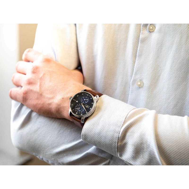ZEPPELIN 8622-3 Capitain's Lineце вираження елегантності та стилю. Він сподобається чоловікам, які цінують точність і якість виконання. Сталевий, сріблястий корпус поєднується з ремінцем з натуральної шкіри. Ремінець надзвичайно м'який і адаптується до зап'ястя. Темно-синій циферблат має цікаве розташування, яке відрізняється від традиційних годинників. Верхній циферблат вказує години, той, що трохи нижче, вказує на секунди, тоді як найбільший циферблат вказує на хвилини. Циферблат чіткий і дозволяє легко зчитувати час. Також в даній моделі є Календар, завдяки якому можна відстежувати поточний день місяця. Одним із найважливіших елементів цього годинника є автоматичний механізм. Не потребує заміни батарейок, автоматичний механічний механізм є справжнім розумінням традицій і сучасності. Годинник буде працювати, поки його носити на руці. Його також можна затягнути вручну за допомогою коронки. Для любителів авіаційного натхнення, класичного стилю та сучасних технологій Zeppelin 8622-3 є ідеальним вибором, який підкреслить характер та індивідуальність у будь-якій ситуації.