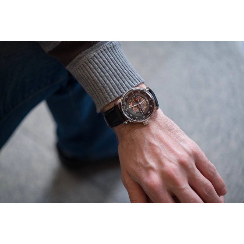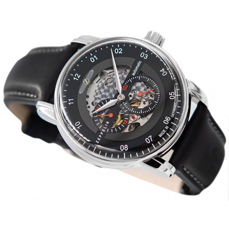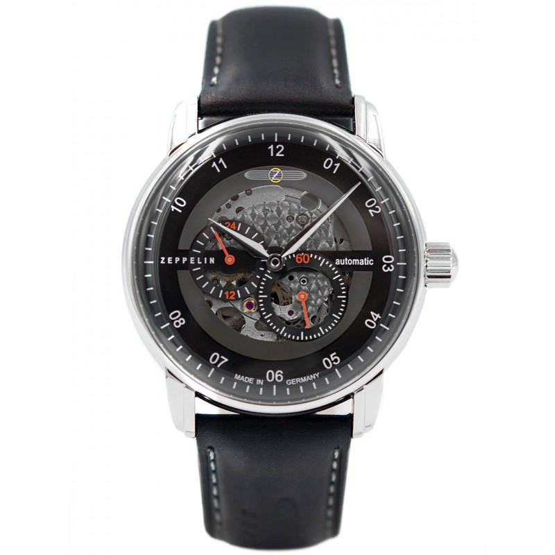 ZEPPELIN 8664-2 NEW CAPITAIN'S LINE стане ідеальним аксесуаром для елегантного чоловіканавіть завдяки використаним кольорам - завжди модний і елегантний чорний у поєднанні зі сріблом. Цікавий, прозорий циферблат -скелетон, покритий опуклим мінеральним склом. Модель засклена, тому ви можете спостерігати за роботою автоматичного механізму з калібром 82S7 і 21 каменем. Годинник буде працювати, поки його носити на руці. Його також можна затягнути вручну за допомогою коронки. Додатковою перевагою є годинник, який показує час у 24-годинному форматі, який розташований зліва.