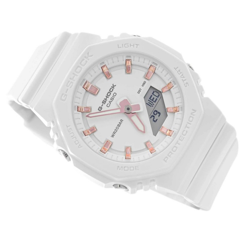 CASIO G-SHOCK GMA-P2100M-7AER – це стильний годинник, розроблений для активних жінок, які цінують функціональність та сучасний дизайн. Виготовлений в елегантних білосніжних кольорах, він чудово доповнить як повсякденний, так і спортивний одяг. Елементи кольору рожевого золота – індекси та стрілки – додають витонченої елегантності загальному вигляду, водночас чітко видно на яскравому циферблаті. Годинник оснащений точним кварцовим механізмом, що забезпечує надійну роботу протягом усього дня. Завдяки компактному та легкому дизайну годинник ідеально сидить на зап'ясті, забезпечуючи комфорт навіть під час напруженого дня. Корпус виготовлений з міцного, ударостійкого матеріалу, а мінеральне скло робить цю модель ідеальною для складних умов.
