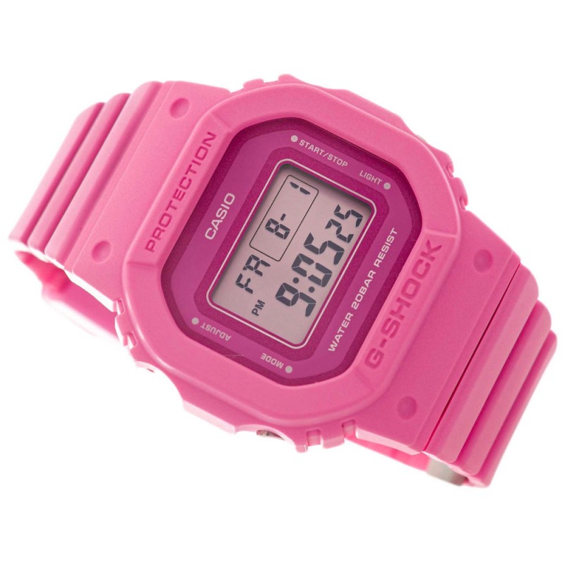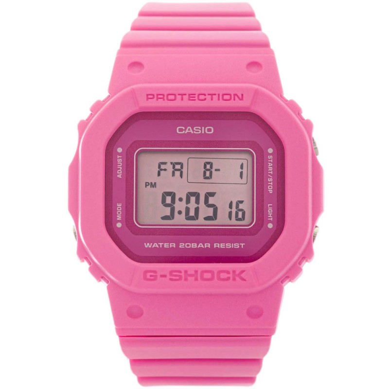 Casio G-SHOCK GMD-S5610PP-4ER – це жіночий цифровий годинник, який вирізняється поєднанням сучасного дизайну та міцної конструкції, характерної для культової серії G-SHOCK. Тонкий корпус виготовлений з легкого, але міцного пластику пастельно-рожевого відтінку. Його спортивний характер підкреслює ремінець, що поєднується в кольорі, з гнучкого матеріалу, що забезпечує комфортне носіння щодня та під час фізичної активності. Все це доповнено мінеральним склом, яке захищає дисплей, та високою водонепроникністю 20 бар, що робить годинник ідеальним для плавання. Ця модель оснащена низкою практичних рішень, які роблять її функціональним інструментом на кожен день. Підсвічування Super-Illuminator забезпечує чудову читабельність за будь-яких умов, а ударостійка система ефективно захищає механізм від ударів та падінь. Функція Display Flasher активує світлодіод, коли лунає будильник, по черзі або після закінчення зворотного відліку таймера, забезпечуючи додаткове візуальне сповіщення. Секундомір дозволяє точно вимірювати час з точністю до 1/100 секунди протягом 24 годин, а таймер автоматичного повтору дозволяє встановити зворотний відлік до однієї секунди та автоматично відновлювати його після завершення. Вбудований будильник пропонує чотири режими роботи: щоденний, щомісячний, певна дата та повтор, що дозволяє налаштувати сповіщення відповідно до ваших індивідуальних потреб. Автоматичний календар запам'ятовує коротші місяці, а вибір 12- або 24-годинного формату дозволяє відображати час у зручний для вас спосіб. Casio G-SHOCK GMD-S5610OPP-4ER поєднує в собі спортивний стиль, довговічність та корисні функції, що робить його придатним як для щоденного використання, так і для більш вимогливих умов. Casio є провідним виробником годинників. Колекція цього японського гіганта включає серію CASIO G-SHOCK, яка характеризується високою міцністю, ударостійкістю та спортивним характером. Технології компанії в поєднанні з матеріалами найвищої якості принесли серії успіх у всьому світі. Багатство кольорів, використання різноманітних матеріалів та широкий спектр функцій – це елементи, які сильно вражають покупців під час вибору годинника. Годинник Casio GMD-S5610PP-4ER є ідеальним прикладом ідеології виробника, пов'язаної з цією серією.