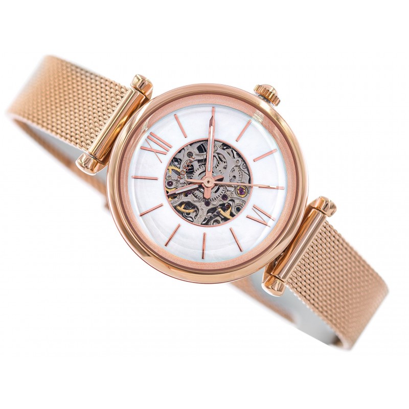 Жіночий годинник FOSSIL Carlie Mini ME3188 стане фантастичним доповненням до жіночого стилю. Гладкий корпус цього годинника виготовлений зі сталі кольору рожевого золота. Сітчастий браслет можна відрегулювати самостійно, не відвідуючи годинникаря. Він оснащений додатковим клапаном, який захищає застібку від випадкового відкриття. Безумовно, найбільшу увагу привертає незвичайний перловий циферблат з частково відкритим механізмом. Використовуваний автоматичний механізм працює на основі енергії, яка накопичується за допомогою руху руки. Ця мініатюрна модель буде привабливо виглядати на жіночому зап'ясті, і може з успіхом замінити елегантні повсякденні прикраси.