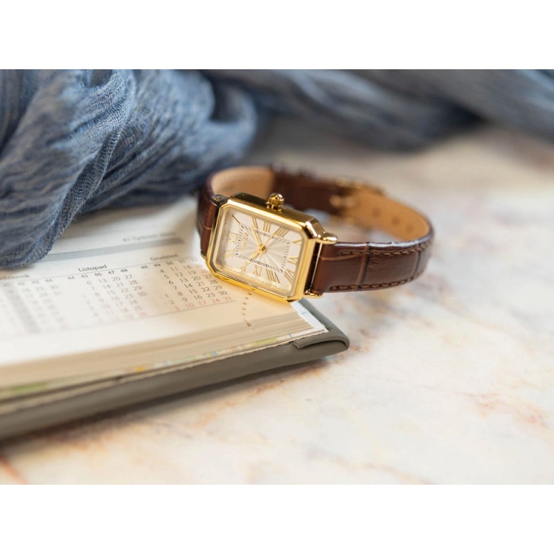 Timex TW2Y00900 Dress – це годинник, у якому класичний дизайн поєднується з теплою, жіночною елегантністю. Прямокутний золотий корпус викликає ретро-естетику, але його стрункі пропорції та вишукані деталі надають всьому сучасного виразу. Дизайн витримано у витончених, гармонійних тонах, що поєднують вишуканість з повсякденною універсальністю. Срібний циферблат прикрашений точним огранюванням, яке делікатно відбиває світло, підкреслюючи елегантний характер композиції. Золоті римські цифри годинникових міток та тонкі стрілки доповнюють образ, створюючи чітке та класичне розташування. Циферблат захищений мінеральним склом, що забезпечує його естетичний вигляд та захищає поверхню від щоденного використання. Годинник закріплений на коричневому ремінці з натуральної шкіри, гладка текстура та м’яка структура якого ідеально доповнюють теплий відтінок золота. Весь виріб був розроблений для жінок, які шукають аксесуар, що поєднує класичні лінії з витонченим характером та високоякісною майстерністю. Сукня Timex TW2Y00900 – це вишукана деталь, яка ідеально поєднується як з елегантними вбраннями, так і з повсякденним життям.