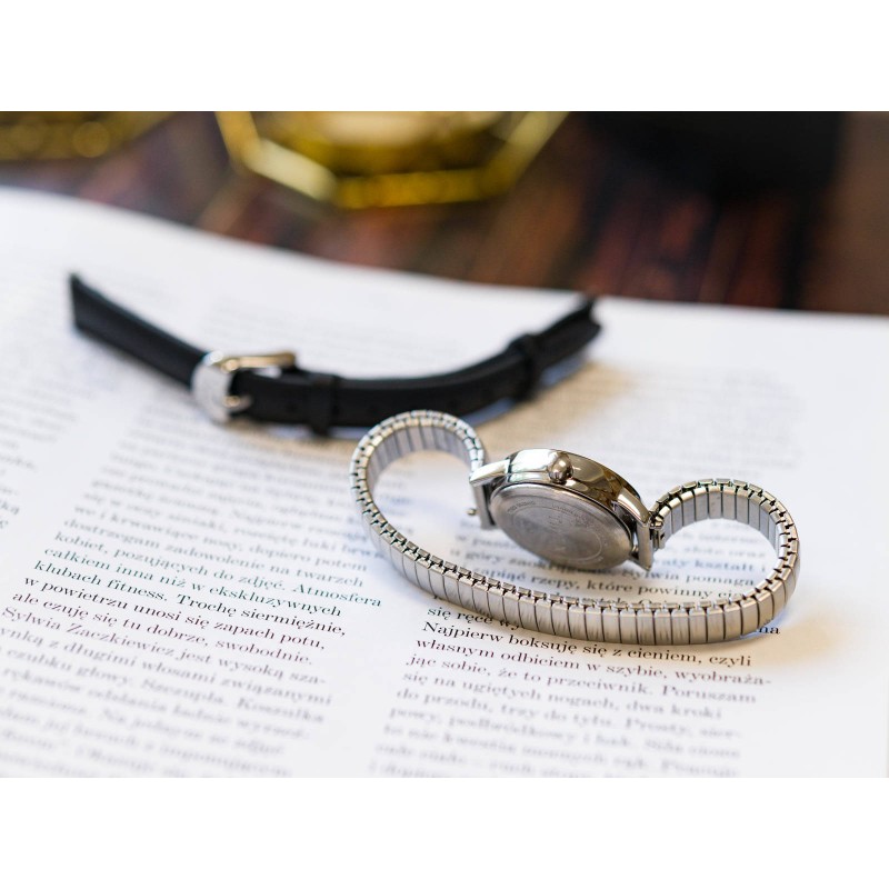 - браслет: сріблястий, додатковий чорний шкіряний ремінець