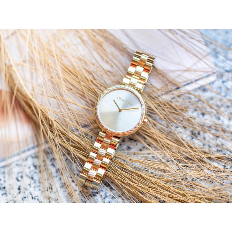 Calvin Klein 25100014 Gleam - це унікальна модель, яка повністю відображає сучасну елегантність, якою славиться цей бренд. І браслет, і корпус ретельно виготовлені з міцної нержавіючої сталі, що надає годиннику розкішний і міцний характер. Золотистий відтінок цих елементів додає шик і винятковий блиск, підкреслюючи його ексклюзивний зовнішній вигляд. Круглий корпус гармонійно поєднує в собі класичний дизайн з сучасними акцентами, завдяки чому годинник ідеально підходить для різноманітних стилів – як повсякденного, так і для особливих випадків. Золотий циферблат із мінімалістичною, але ефектною обробкою чудово доповнює загальний дизайн, створюючи гармонійну та витончену композицію. На циферблаті ми знаходимо делікатно розміщений логотип бренду та тонкий сонячний виріз, який надає годинникові глибини. Циферблат захищено стійким до подряпин мінеральним склом, яке гарантує тривалий захист від пошкоджень. Браслет, також виготовлений з високоякісної нержавіючої сталі, оснащений елегантною та зручною застібкою-метеликом, що підвищує комфорт використання. Усередині корпусу знаходиться точний кварцовий механізм, що живиться від батарейок, який забезпечує надійну роботу годинника. Calvin Klein 25100014 Gleam – це більше, ніж просто годинник – це стильний аксесуар, який успішно виконує роль ювелірної прикраси, додаючи нотки вишуканості та розкоші будь-якому стилю. Цей годинник упакований в елегантну оригінальну упаковку від виробника, ідеально підходить як подарунок для коханої людини.