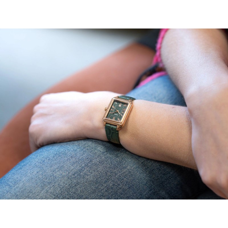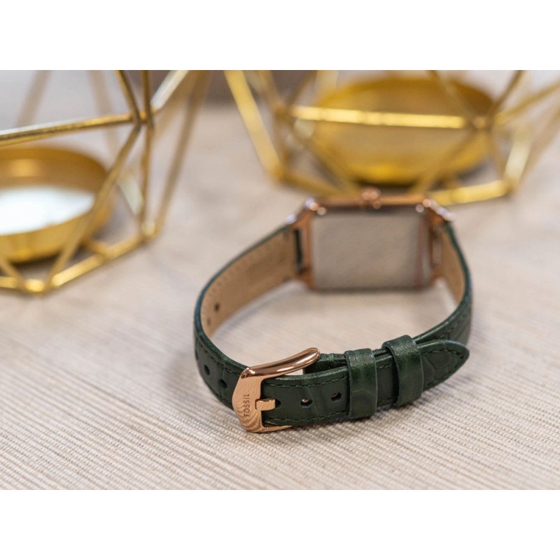 Fossil Raquel ES5366 зберігає елегантність, характерну для цієї лінійки, але в цій версії він отримує абсолютно нову, більш виразну кольорову палітру. Тонкий прямокутний корпус з нержавіючої сталі оздоблений відтінком рожевого золота, що додає дизайну тепла та ніжного блиску. Його пропорції підкреслюють класичні лінії годинника, а точна обробка поверхні підкреслює ретельну увагу до деталей. Зелений циферблат глибокого, благородного тону створює привабливий контраст з елементами рожевого золота. Римські цифри годинникових міток та витончено контуровані стрілки зберігають чудову читабельність, а їхнє металеве покриття підкреслює елегантний, класичний характер моделі. На позначці 6 годин знаходиться індикатор дати, мінімалістичний дизайн якого ідеально доповнює симетрію та впорядковану композицію циферблата. Зелений шкіряний ремінець, що відповідає кольору циферблата, доповнює образ. Його натуральна текстура та м’яка конструкція забезпечують комфортне носіння та естетично приємний вигляд. Усередині корпусу знаходиться кварцовий механізм, цінний за свою стабільність і точність. Fossil Raquel ES5366 постачається в металевій коробці Fossil, яка підкреслює увагу до деталей і забезпечує практичну, але привабливу упаковку. Американський бренд Fossil вирізняється своїм ретро-стилем, який безумовно привертає увагу покупців. Ці годинники дуже популярні як серед жінок, так і серед чоловіків. Це чудовий варіант завдяки гарному співвідношенню ціни та якості. Варто додати, що бренд також має у своїй колекції сучасні смарт-годинники із сенсорними екранами, тому Fossil — це правильний вибір для вас, незалежно від того, чи шукаєте ви класичний годинник, чи сучасний смарт-годинник.